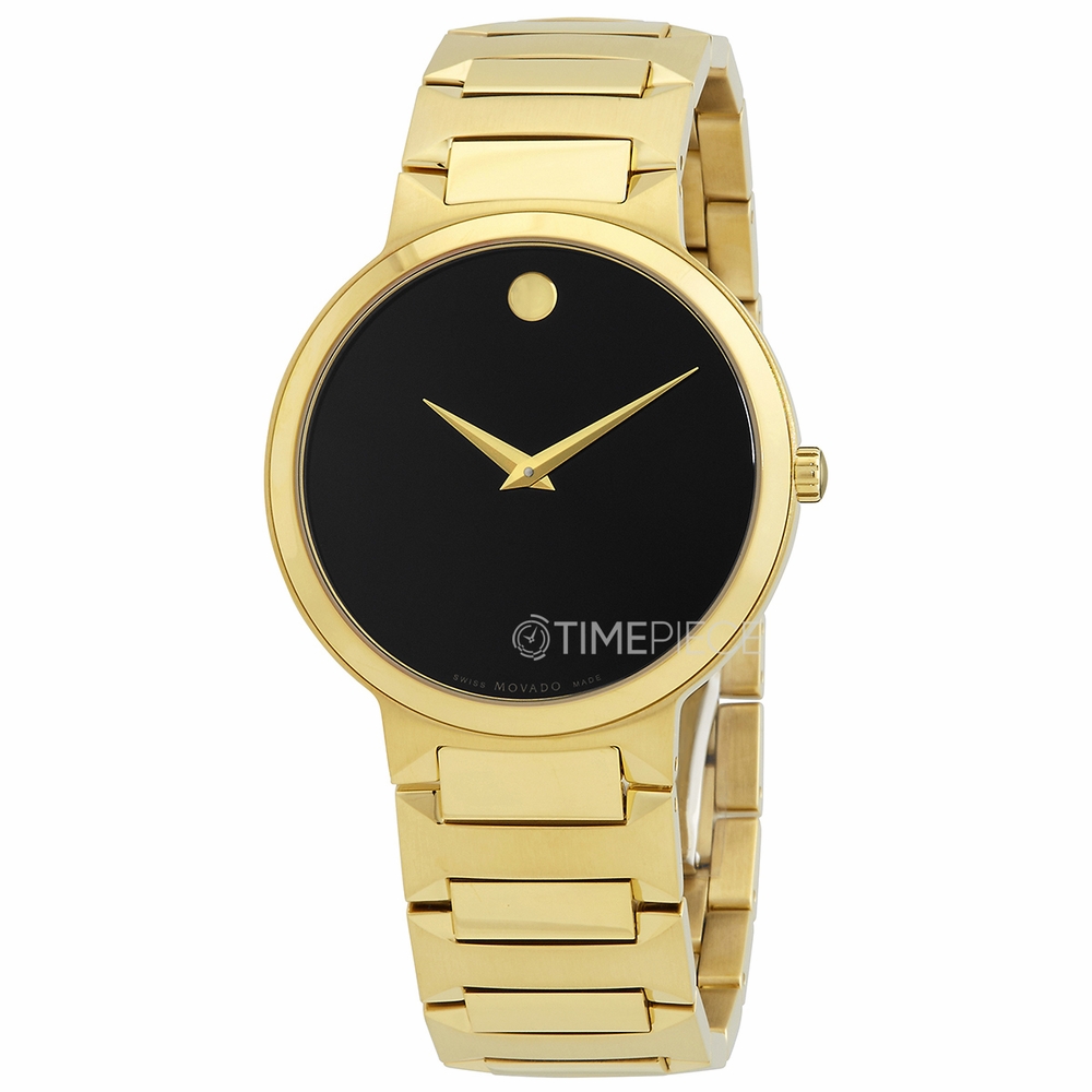 Gold ion-plated stainless steel case and bracelet. Fixed gold ion-plated stainless steel bezel. Black museum dial with gold-tone hands. No markers. Movado dot appears at the 12 o'clock position. Dial Type: Analog. Quartz movement. Scratch resistant sapphire crystal. Pull / push crown. Solid case back. Round case shape, case size: 38 mm. Hidden fold over clasp. Water resistant at 30 meters / 100 feet. Functions: hour, minute. Temo Series. Dress watch style. Watch label: Swiss Made. Movado Temo Quartz Black Museum Dial Unisex Watch 0607294.