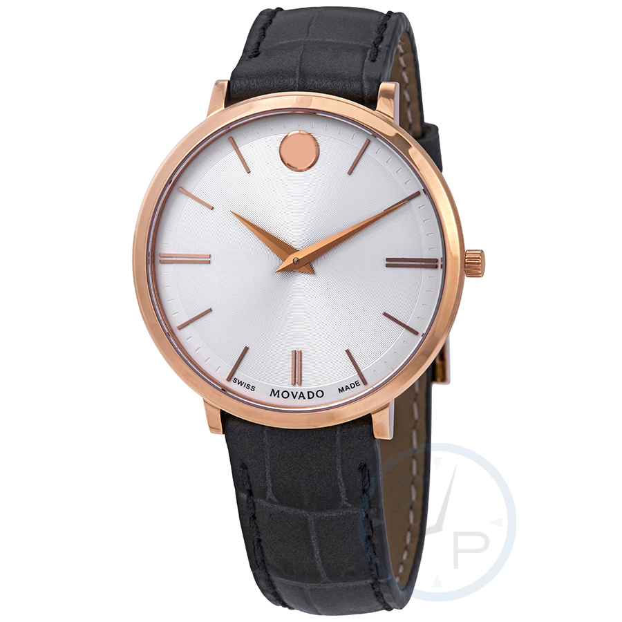 Rose gold-tone stainless steel case with a black leather strap. Fixed gold-tone stainless steel bezel. Silver dial with rose gold-tone hands and index hour markers. Dial Type: Analog. Quartz movement. Scratch resistant sapphire crystal. Solid case back. Round case shape. Case size: 40 mm. Buckle clasp. Functions: hour, minute. Casual watch style. Watch label: Swiss Made. Movado Silver Dial Mens Black Leather Watch 0607177.