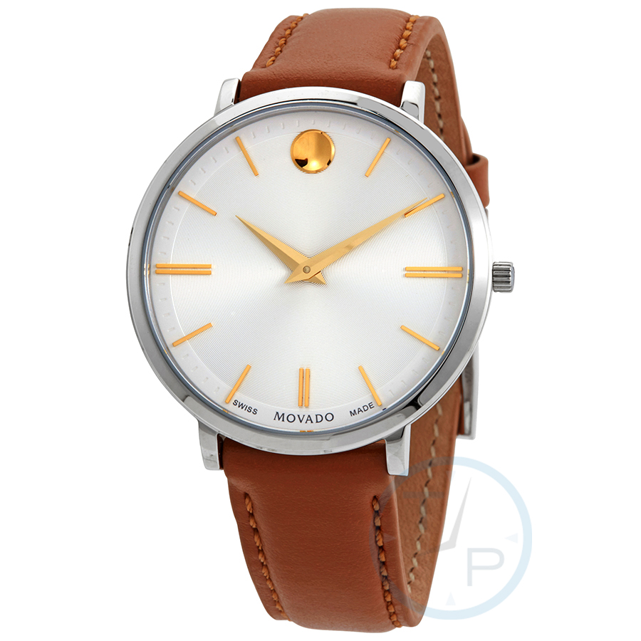 Stainless steel case with a tan leather strap. Fixed stainless steel bezel. Silver white dial with yerllow gold-tone hands and index hour markers. The Movado dot appears at the 12 o'clock position. Dial Type: Analog. Quartz movement. Scratch resistant sapphire crystal. Pull / push crown. Solid case back. Round case shape. Case size: 35 mm. Case thickness: 6.7 mm. Band width: 18 mm. Tang clasp. Water resistant at 30 meters / 100 feet. Functions: hour, minute. Casual watch style. Watch label: Swiss Made. Movado Ultra Slim Quartz Silver White Dial Ladies Watch 0607371.