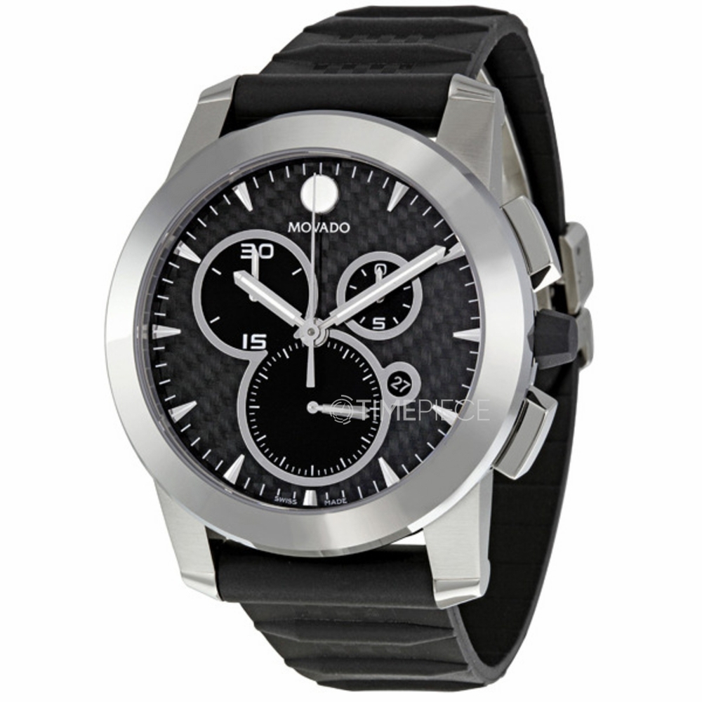 Stainless steel case with a black rubber strap. Fixed stainless steel bezel. Black dial with luminous silver-tone hands and index hour markers. Minute markers around the outer rim. The Marvardo dot appears at the 12 o'clock position. Dial Type: Analog. Luminescent hands and markers. Date display appears at the 4 o'clock position. Chronograph - three sub-dials displaying: 60 seconds, 30 minutes and 1/10th of a second. Swiss quartz movement. Scratch resistant sapphire crystal. Solid case back. Case diameter: 45 mm. Band width: 22..5 mm. Deployment clasp. Water resistant at 30 meters / 100 feet. Functions: hours, minutes, seconds, chronograph, date. Dress watch style. Watch label: Swiss Made. Movado Vizio Anthracite Dial Mens Watch 0606082.