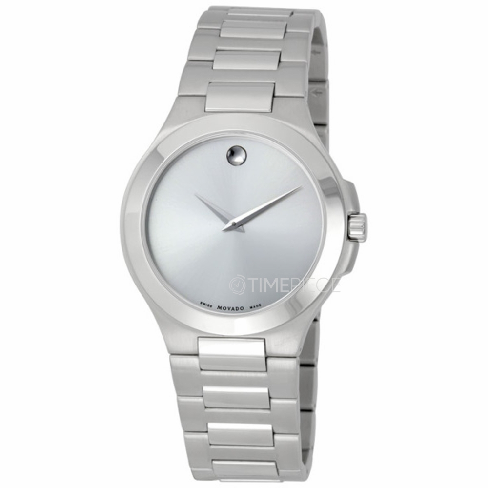 Stainless steel case with a stainless steel bracelet. Fixed stainless steel bezel. Silver dial with silver-tone hands. No markers. The Movado dot appears at the 12 o'clock position. Dial Type: Analog. Luminescent hands and dial markers. Quartz movement. Scratch resistant sapphire crystal. Pull / push crown. Solid case back. Round case shape. Case size: 42 mm. Band width: 21 mm. Deployment clasp. Water resistant at 30 meters / 100 feet. Functions: hour/ minute. Corporate Exclusive Series. Dress watch style. Watch label: Swiss Made. Movado Corporate Exclusive Silver Dial Mens Watch 0606165.