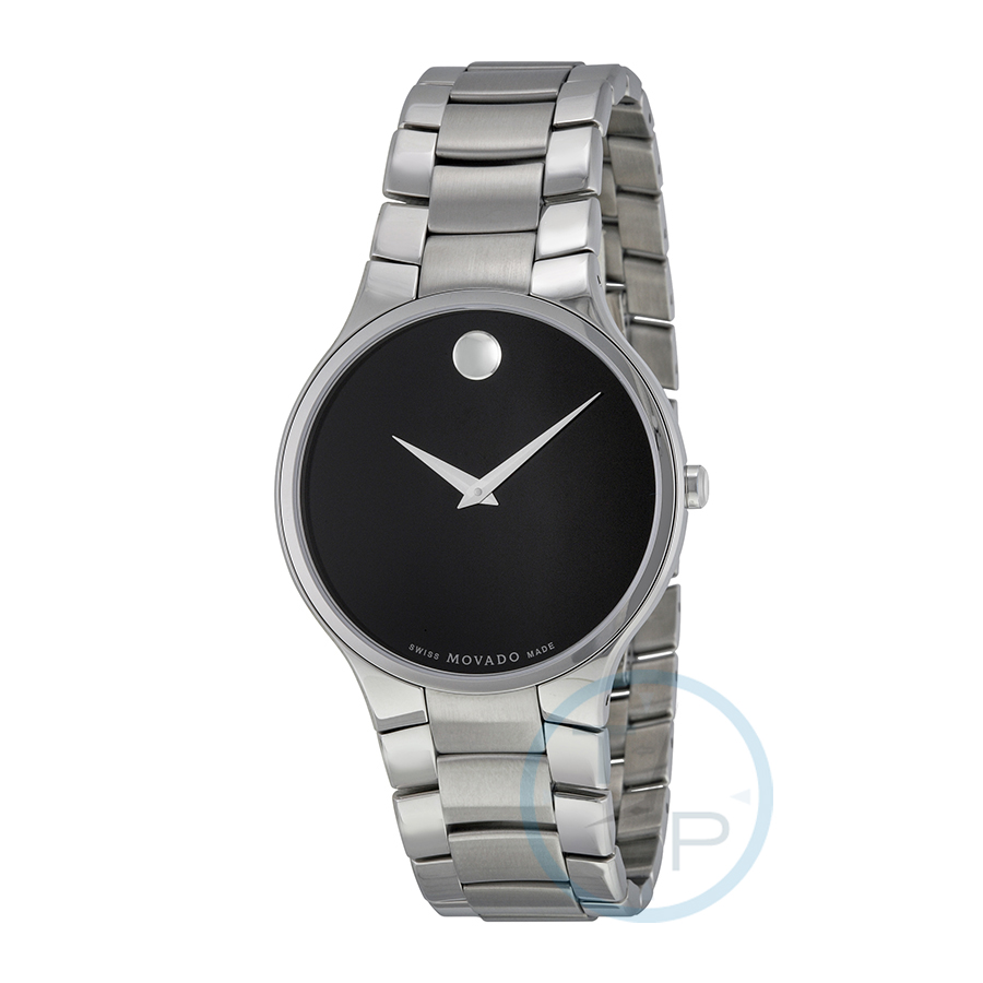 Stainless steel case with a stainless steel bracelet. Fixed stainless steel stainless steel bezel. Black dial with silver-tone hands. No markers. movado dot appears at the 12 o'clock position. Dial Type: Analog. Quartz movement. Scratch resistant sapphire crystal. Pull / push crown. Solid case back. Round case shape. Case size: 38 mm. Case thickness: 7 mm. Band width: 21 mm. Hidden fold over clasp. Water resistant at 30 meters / 100 feet. Functions: hours, minute. Dress watch style. Watch label: Swiss Made. Movado Serio Black Dial Stainless Steel Mens Watch 0606382.
