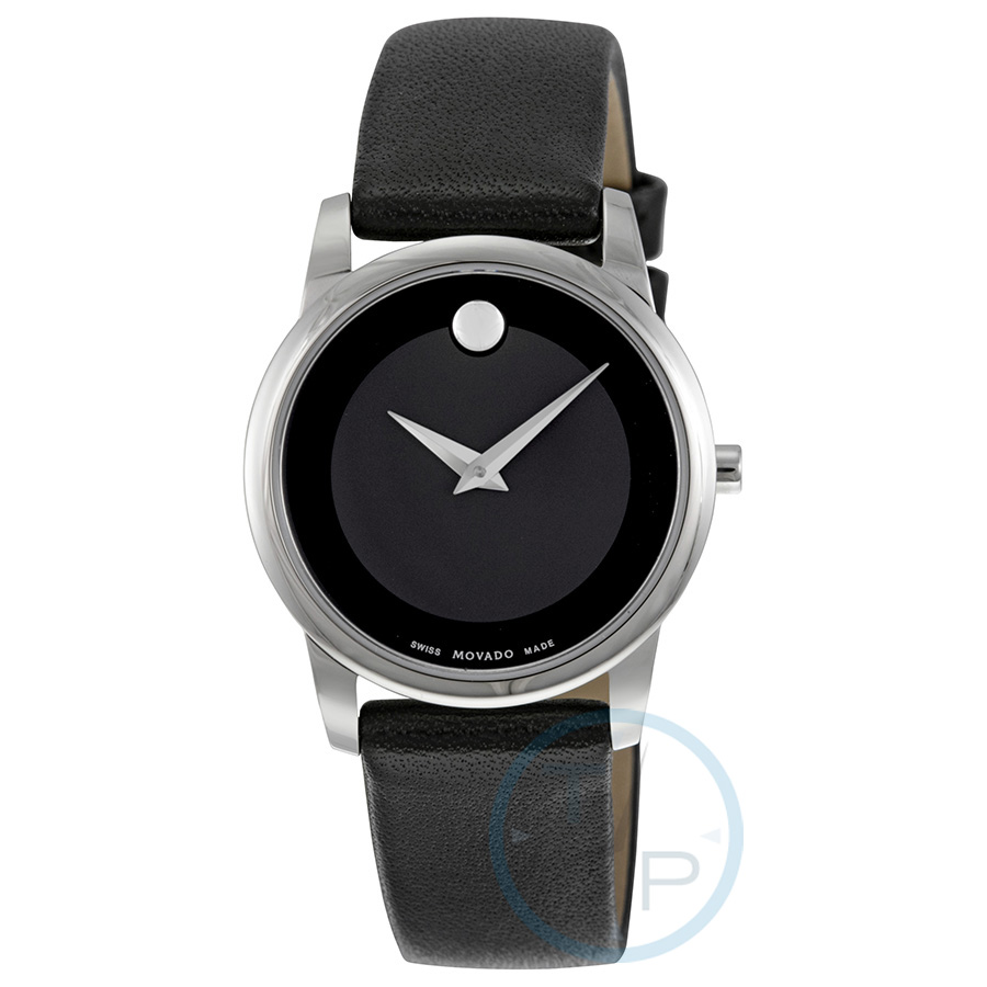 Silver-tone stainless steel case with a black leather strap. Fixed silver-tone stainless steel bezel. Black dial with silver-tone dauphine-style shape hands and the signature Movado dot appears at the 12 o'clock position. No markers. Dial Type: Analog. Quartz movement. Scratch resistant sapphire crystal. Pull / push crown. Solid case back. Round case shape, case size: 28 mm, case thickness: 6.5 mm. Band width: 14.9 mm. Tang clasp. Water resistant at 30 meters / 100 feet. Functions: hours, minutes. Dress watch style. Watch label: Swiss Made. Movado Museum Black Dial Black Leather Ladies Watch 0606503.