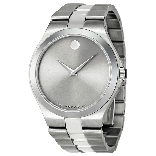 Silver-tone stainless steel case with a silver-tone stainless steel bracelet. Fixed silver-tone stainless steel bezel. Silver dial with silver-tone dauphine-style shape hands and the signature Movado dot appears at the 12 o'clock position. No markers. Dial Type: Analog. Quartz movement. Scratch resistant sapphire crystal. Pull / push crown. Solid case back. Round case shape, case size: 40 mm, case thickness: 8.15 mm. Band width: 22 mm. Deployment with push button release clasp. Water resistant at 30 meters / 100 feet. Functions: hour, minute. Dress watch style. Watch label: Swiss Made. Movado Silver Dial Stainless Steel Mens Watch 0606556.
