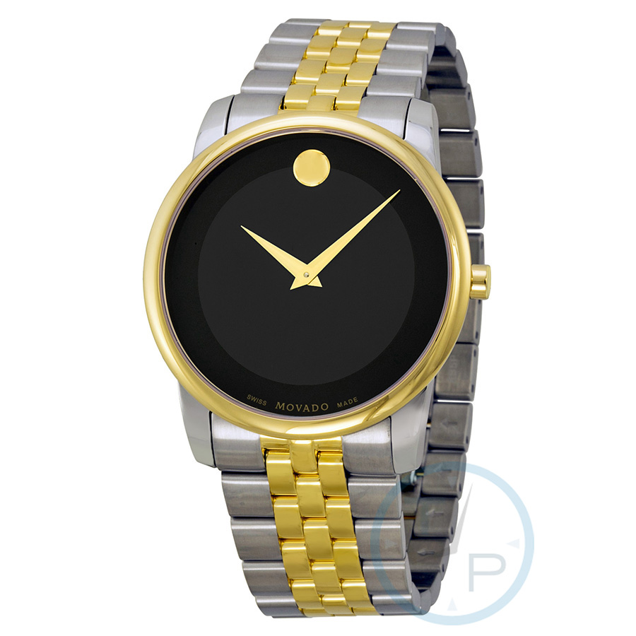REPLACED WITH 0606899. Two-tone stainless steel case with a two-tone (silver-tone and gold-tone) stainless steel bracelet. Fixed gold-tone bezel. Black dial with gold-tone dauphine-style shape hands and the signature Movado dot appears at the 12 o'clock position. No markers. Dial Type: Analog. Quartz movement. Scratch resistant sapphire crystal. Pull / push crown. Solid case back. Round case shape. Case size: 40 mm. Deployment with push button release clasp. Water resistant at 30 meters / 100 feet. Functions: hour, minute. Dress watch style. Watch label: Swiss Made. Movado Museum Black Dial Two-Tone Stainless Steel Mens Watch 0606605.