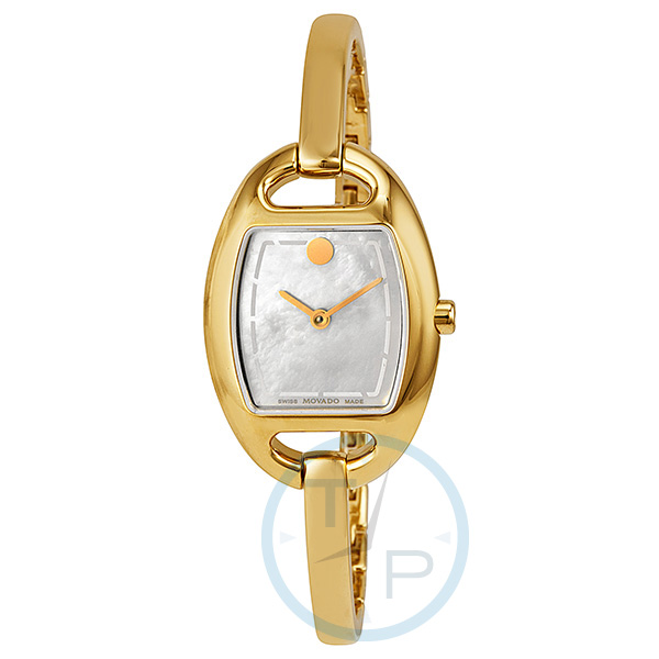 Yellow gold-tone stainless steel case with a yellow gold-tone stainless steel bracelet. Fixed gold-tone stainless steel bezel. Mother of pearl dial with gold-tone hands and the signature Movado dot appears at the 12 o'clock position. Dial Type: Analog. Quartz movement. Scratch resistant sapphire crystal. Pull / push crown. Solid case back. Tonneau case shape, case size: 30 mm x 23.5 mm, case thickness: 6.3 mm. Band width: 4.5 mm. Jewelry clasp. Water resistant at 30 meters / 100 feet. Functions: hour, minute. Dress watch style. Watch label: Swiss Made. Movado Museum Mother of Pearl Dial Gold-Tone Steel Bangle Ladies Watch 0606608.