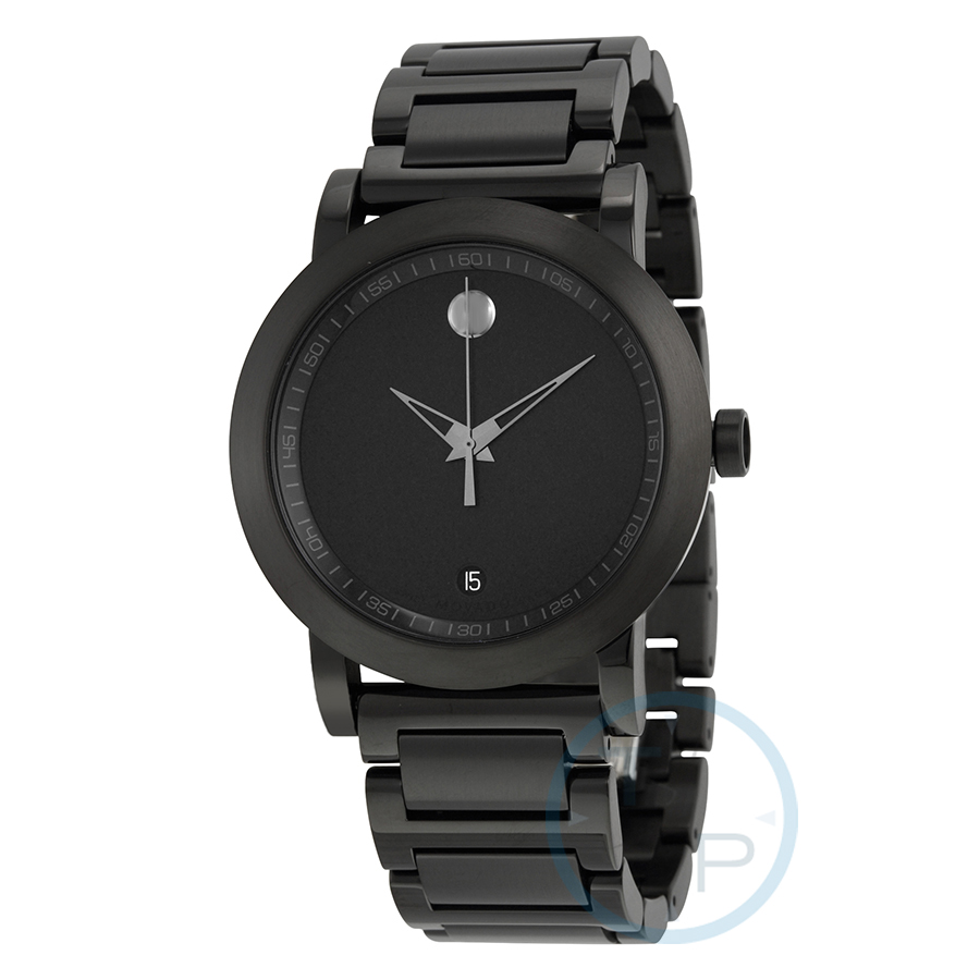 Black PVD stainless steel case and bracelet. Fixed black PVD bezel. Black dial with black hands and index hour markers. Arabic numeral minute markers (at 5 minute intervals). Minute markers around the outer rim. The Movado dot appears at the 12 o'clock position. Dial Type: Analog. Date display at the 6 o'clock position. Quartz movement. Scratch resistant sapphire crystal. Pull / push crown. Solid case back. Case diameter: 42 mm. Round case shape. Deployment clasp with a push button release. Water resistant at 30 meters / 100 feet. Functions: date, hour, minute, second. Casual watch style. Watch label: Swiss Made. Movado Museum Sport Black Dial Black PVD Stainless Steel Mens Watch 0606615.