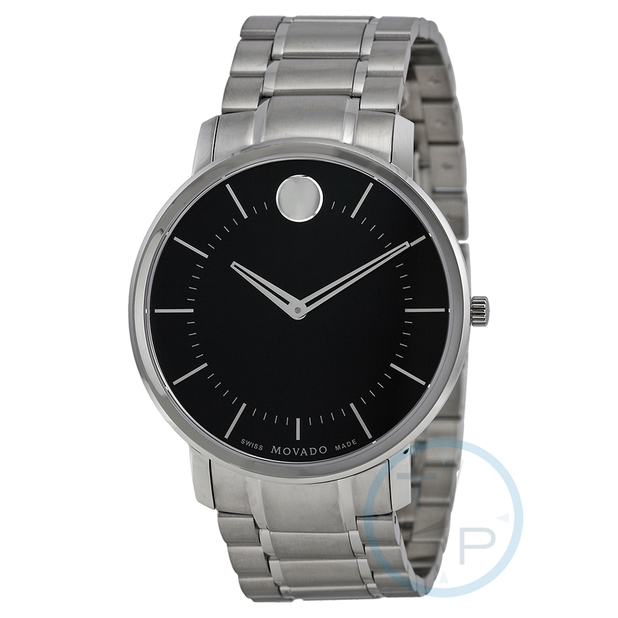 Stainless steel case with a stainless steel bracelet. Fixed stainless steel bezel. Black dial with silver-tone skeleton hands and index hour markers. The Movado dot marks the 12 o'clock position. Minute markers around an inner ring. Dial Type: Analog. Quartz movement. Scratch resistant sapphire crystal. Pull / push crown. Solid case back. Round case shape. Case size: 40 mm. Case thickness: 6 mm. Band width: 21 mm, band length: 8 inches. Deployment clasp with a push button release. Water resistant at 30 meters / 100 feet. Functions: hour, minute. Dress watch style. Watch label: Swiss Made. Movado Thin Classic Black Dial Stainless Steel Mens Watch 0606687.