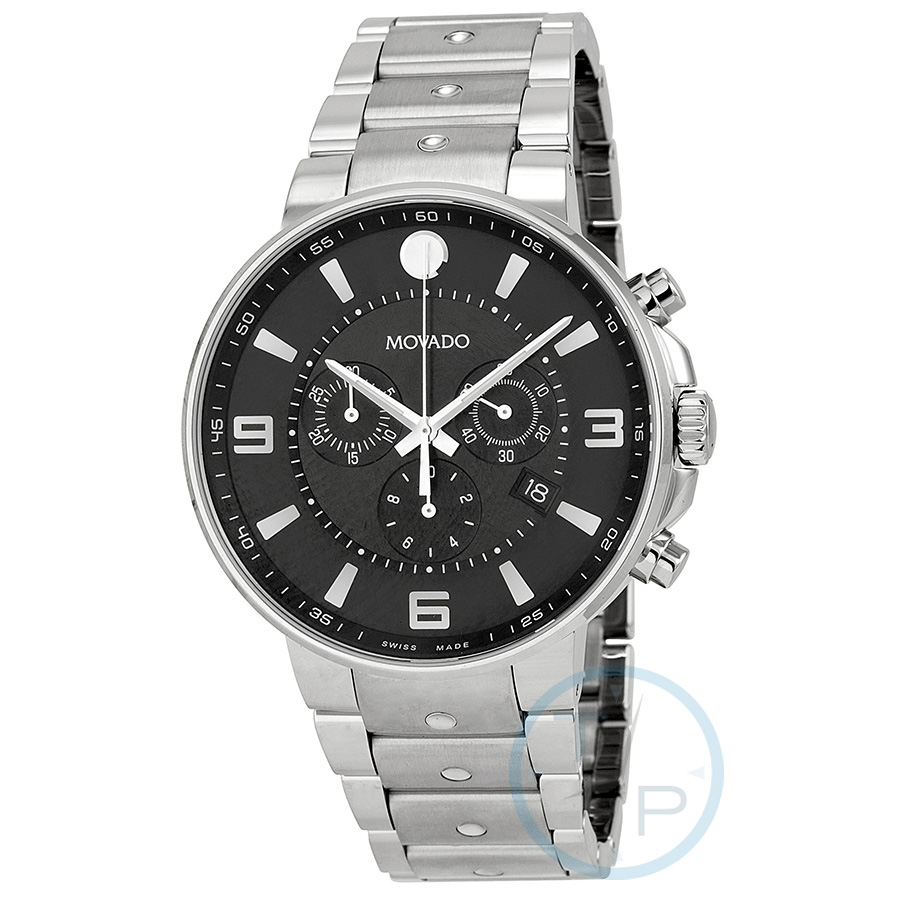 Stainless steel case with a stainless steel bracelet. Fixed stainless steel bezel. Black dial with silver-toned hands and index hour markers. Arabic numerals mark the 3, 6 and 9 o'clock positions. Minute markers around the outer rim. The Movado dot marks the 12 o'clock position. Dial Type: Analog. Luminescent hands and markers. Date display at the 4 o'clock position. Chronograph - three sub-dials displaying: 60 second, 30 minute and 1/10th of a second. Swiss quartz movement. Scratch resistant sapphire crystal. Solid case back. Case diameter: 42 mm. Round case shape. Deployment clasp. Water resistant at 30 meters / 100 feet. Functions: chronograph, date, hour, minute, second. Dress watch style. Watch label: Swiss Made. Movado SE Pilot Black Dial Stainless Steel Chronograph Mens Watch 0606759.
