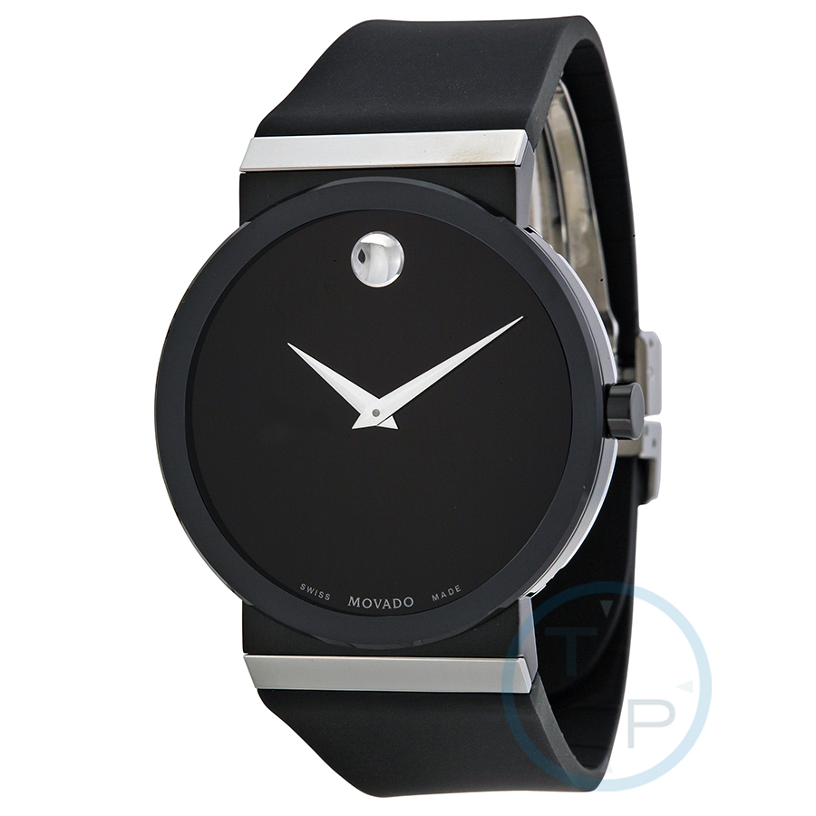 Black PVD stainless steel case with a black silicone rubber strap. Fixed black PVD stainless steel bezel. Black dial with silver-tone dauphine-style shape hands and the signature Movado dot appears at the 12 o'clock position. Dial Type: Analog. Quartz movement. Scratch resistant sapphire crystal. Pull / push crown. Solid case back. Round case shape. Case size: 42 mm. Band length: 7 inches. Deployment clasp. Water resistant at 30 meters / 100 feet. Functions: hour, minute. Casual watch style. Watch label: Swiss Made. Movado Sapphire Synergy Black Dial Black Rubber Mens Watch 606780.