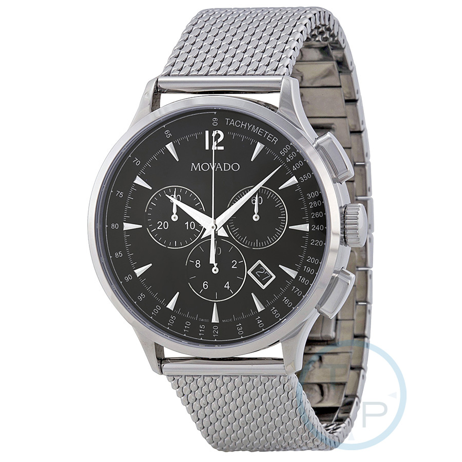 Stainless steel case with a stainless steel mesh bracelet. Fixed stainless steel bezel. Black dial with silver-tone hands and index hour markers. An Arabic numeral marks the 12 o'clock position. Minute markers. Tachymeter around the outer rim. Dial Type: Analog. Date display between the 4 and 5 o'clock positions. Chronograph - three sub-dials displaying: 60 second, 30 minute and 1/10th of a second. Quartz movement. Scratch resistant sapphire crystal. Pull / push crown. Solid case back. Case diameter: 42 mm. Case thickness: 14 mm. Round case shape. Band width: 21 mm. Band length: 8 inches. Deployment clasp. Water resistant at 30 meters / 100 feet. Functions: chronograph, tachymeter, date, hour, minute, second. Casual watch style. Movado Circa Chronograph Black Dial Stainless Steel Mesh Mens Watch 0606803.