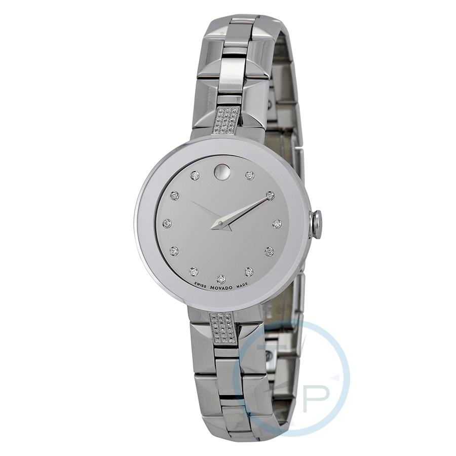 Silver-tone stainless steel case with a silver-tone stainless steel bracelet. Fixed silver-tone stainless steel bezel. Silver dial with silver-tone hands and diamond hour markers. The Movado dot marks the 12 o'clock position. Dial Type: Analog. Quartz movement. Scratch resistant sapphire crystal. Pull / push crown. Solid case back. Round case shape. Case size: 28 mm. Deployment clasp. Water resistant at 30 meters / 100 feet. Functions: hour, minute. Dress watch style. Watch label: Swiss Made. Movado Sapphire Silver Diamond Dial Ladies Watch 0606815.