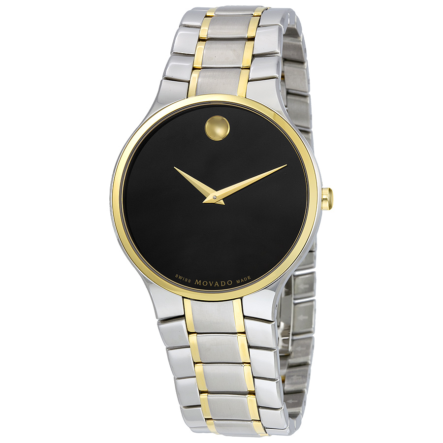 Stainless steel case with a two-tone (silver-tone and gold PVD) Stainless Steel bracelet. Fixed gold PVD bezel. Black with concave dot dial with gold-tone hands. No markers. The Movado dot appears at the 12 o'clock position. Dial Type: Analog. Quartz movement. Scratch resistant sapphire crystal. Pull / push crown. Solid case back. Case size: 38 mm. Case thickness: 7 mm. Round case shape. Band width: 20 mm. Deployment clasp. Water resistant at 30 meters / 100 feet. Functions: hour, minute. Additional Info: in general, withstands splashes or brief immersion in water, but not suitable for swimming or bathing. Dress watch style. Watch label: Swiss Made. Movado Serio Mens Watch 0606901.