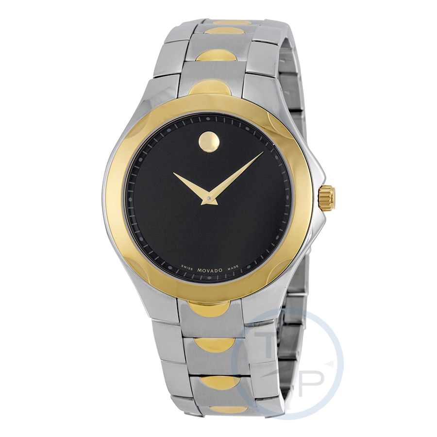 Stainless steel case with a two-tone (silver and yellow gold-plated) stainless steel bracelet. Fixed yellow gold-plated bezel. Black dial with yellow gold-tone hands and dot hour markers. Minute markers around the outer rim. The Movado dot appears at the 12 o'clock position. Dial Type: Analog. Quartz movement. Scratch resistant sapphire crystal. Pull / push crown. Solid case back. Round case shape. Case size: 40 mm. Case thickness: 7.5 mm. Band width: 20 mm. Deployment clasp. Water resistant at 30 meters / 100 feet. Functions: hour, minute. Dress watch style. Watch label: Swiss Made. Movado Luno Sport Black Dial Two-tone Mens Watch 0606906.