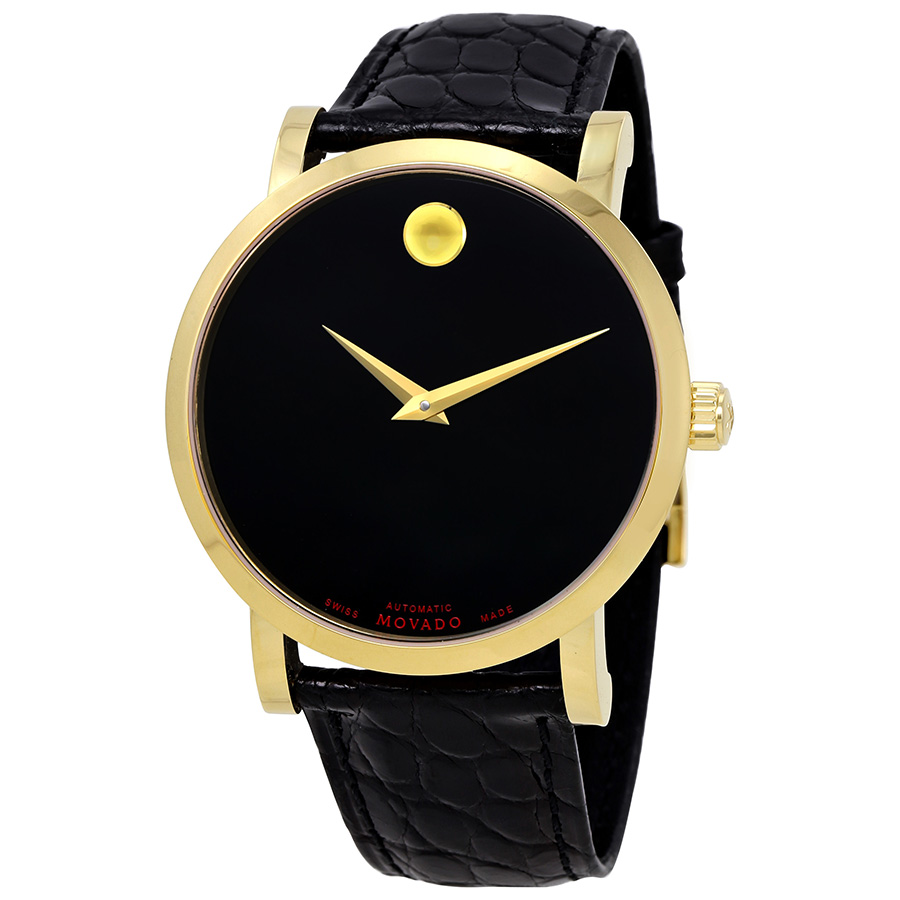 Yellow gold PVD stainless steel case with a black leather strap. Fixed yellow gold PVD bezel. Black dial with yellow gold-tone hands. No markers. The Movado dot appears at the 12 o'clock position. Dial Type: Analog. Automatic movement. Scratch resistant synthetic sapphire crystal. Pull / push crown. Transparent case back. Round case shape. Case size: 42 mm. Case thickness: 9 mm. Band width: 22 mm. Tang clasp. Water resistant at 30 meters / 100 feet. Functions: hour, minute. Additional Info: n general, withstands splashes or brief immersion in water, but not suitable for swimming. Dress watch style. Watch label: Swiss Made. Movado Red Label Automatic Black Dial Mens Watch 0607007.