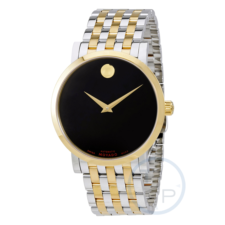 Stainless steel case with a two-tone (silver and gold PVD) stainless steel bracelet. Fixed gold PVD bezel. Black dial with gold-tone hands. No markers. The Movado dot appears at the 12 o'clock position. Dial Type: Analog. Automatic movement. Scratch resistant sapphire crystal. Pull / push crown. Transparent case back. Case size: 42 mm. Case thickness: 9 mm. Round case shape. Band width: 21 mm. Deployment clasp with a push button release. Water resistant at 30 meters / 100 feet. Functions: hour, minute. Dress watch style. Watch label: Swiss Made. Movado Red Label Automatic Black Dial Mens Watch 0607008.