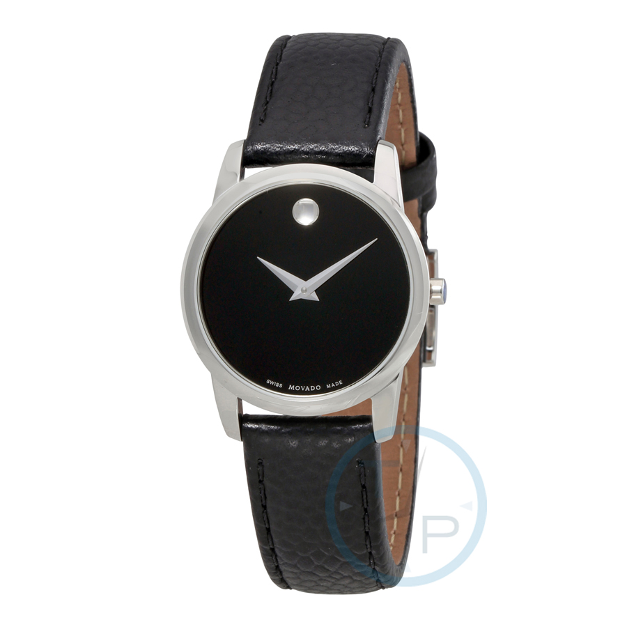 Silver-tone stainless steel case with a black (calfskin) leather strap. Fixed silver-tone stainless steel bezel. Black dial with silver-tone hands. No markers. The Movado dot marks the 12 o'clock position. Dial Type: Analog. Quartz movement. Scratch resistant sapphire crystal. Solid case back. Case size: 28 mm. Round case shape. Band width: 20 mm. Tang clasp. Water resistant at 30 meters / 100 feet. Functions: hour, minute. Casual watch style. Watch label: Swiss Made. Movado Museum Classic Black Dial Black Leather Ladies Watch 0607015.