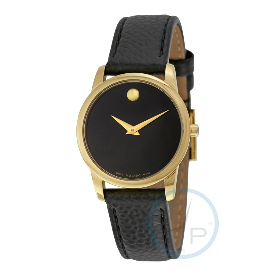 Yellow gold PVD stainless steel case with a black leather strap. Fixed yellow gold PVD bezel. Black dial with yellow gold-tone hands. No markers. The Movado dot marks the 12 o'clock position. Dial Type: Analog. Quartz movement. Scratch resistant sapphire crystal. Pull / push crown. Solid case back. Case size: 28 mm. Round case shape. Band width: 14 mm. Band length: 7 inches. Tang clasp. Water resistant at 30 meters / 100 feet. Functions: hour, minute. Casual watch style. Watch label: Swiss Made. Movado Museum Classic Black Dial Black Leather Ladies Watch 0607016.