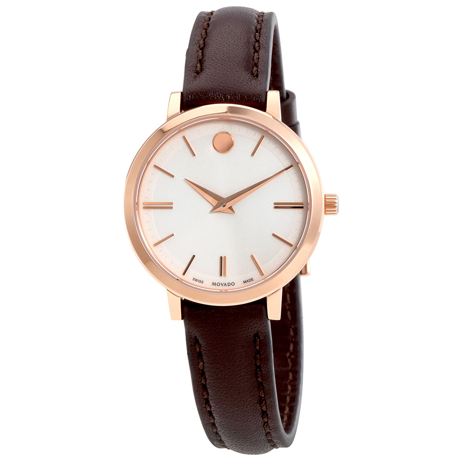 Rose gold PVD stainless steel case with a brown (calfskin) leather strap. Fixed rose gold PVD bezel. Silver dial with rose gold-tone hands and index hour markers. The Movado dot appears at the 12 o'clock position. Dial Type: Analog. Quartz movement. Scratch resistant sapphire crystal. Pull / push crown. Solid case back. Round case shape. Case size: 28 mm. Tang clasp. Water resistant at 30 meters / 100 feet. Functions: hour, minute. Dress watch style. Watch label: Swiss Made. Movado Ultra Slim Silver Dial Brown Leather Ladies Watch 0607096