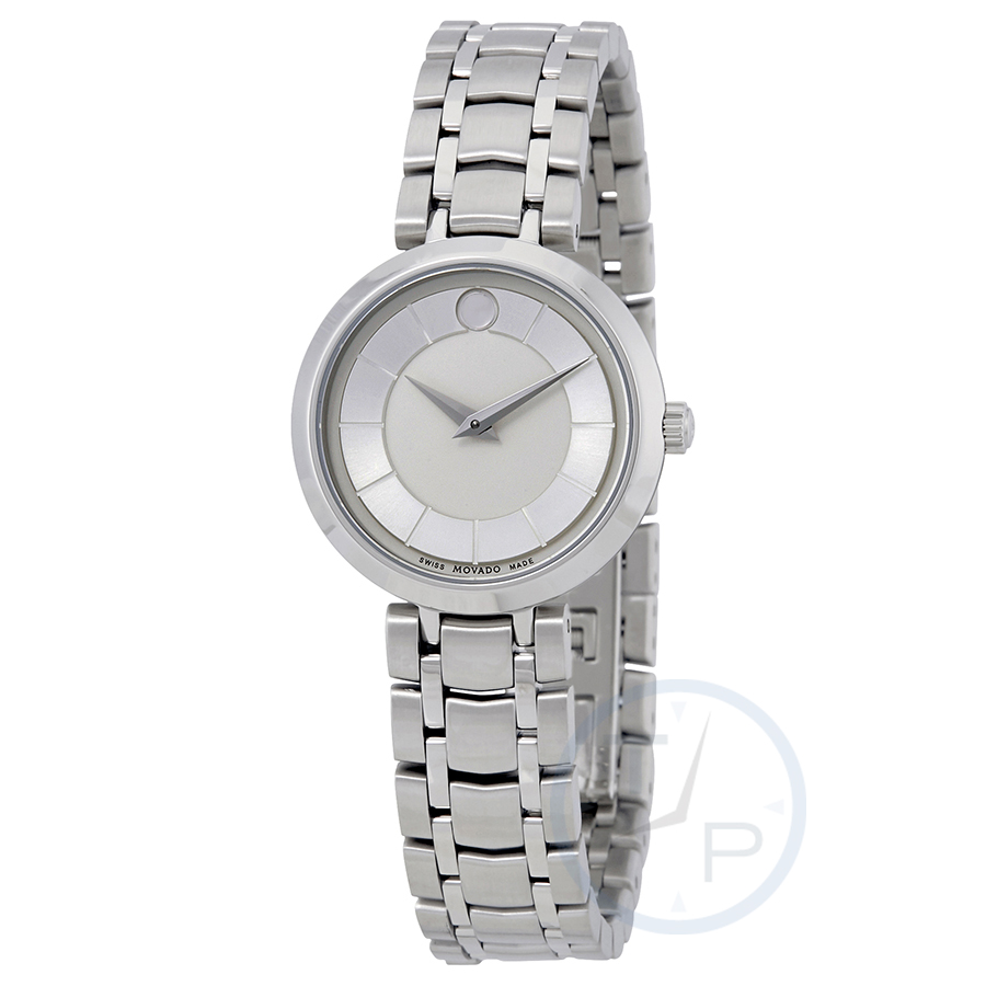 Stainless steel case with a stainless steel bracelet. Fixed stainless steel bezel. Silver dial with silver-tone dauphine-style hands and index hour markers. No markers. The Movado dot marks the 12 o'clock position. Dial Type: Analog. Quartz movement. Scratch resistant sapphire crystal. Pull / push crown. Solid case back. Round case shape. Case size: 28 mm. Case thickness: 7 mm. Band width: 13 mm. Fold over clasp. Water resistant at 30 meters / 100 feet. Functions: hour, minute. 1881 Series. Dress watch style. Watch label: Swiss Made. Movado 1881 Silver Dial Stainless Steel Ladies Watch 0607098.