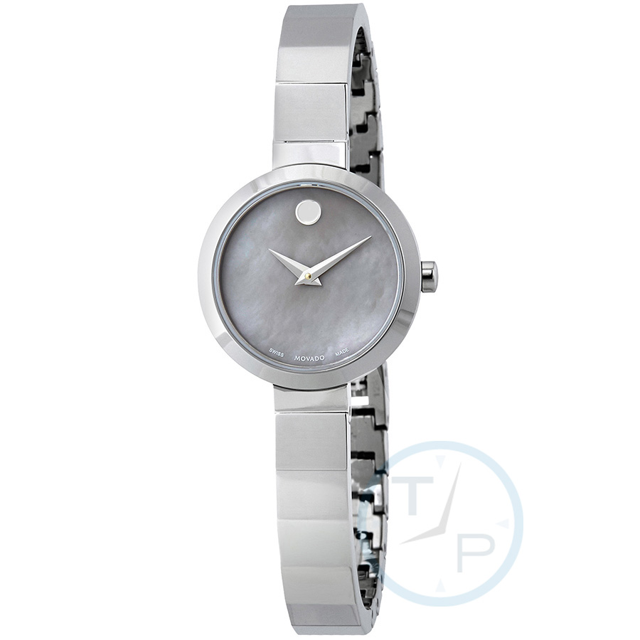 Silver-tone stainless steel case and bracelet. Fixed silver-tone bezel. White mother of pearl dial with silver-tone hands. No markers. The Movado dot marks the 12 o'clock position. Dial Type: Analog. Quartz movement. Scratch resistant sapphire crystal. Pull / push crown. Solid case back. Case size: 24 mm. Round case shape. Jewelry clasp. Water resistant at 30 meters / 100 feet. Functions: hour, minute. Dress watch style. Watch label: Swiss Made. Movado Novella White Mother of Pearl Dial Ladies Watch 0607110.