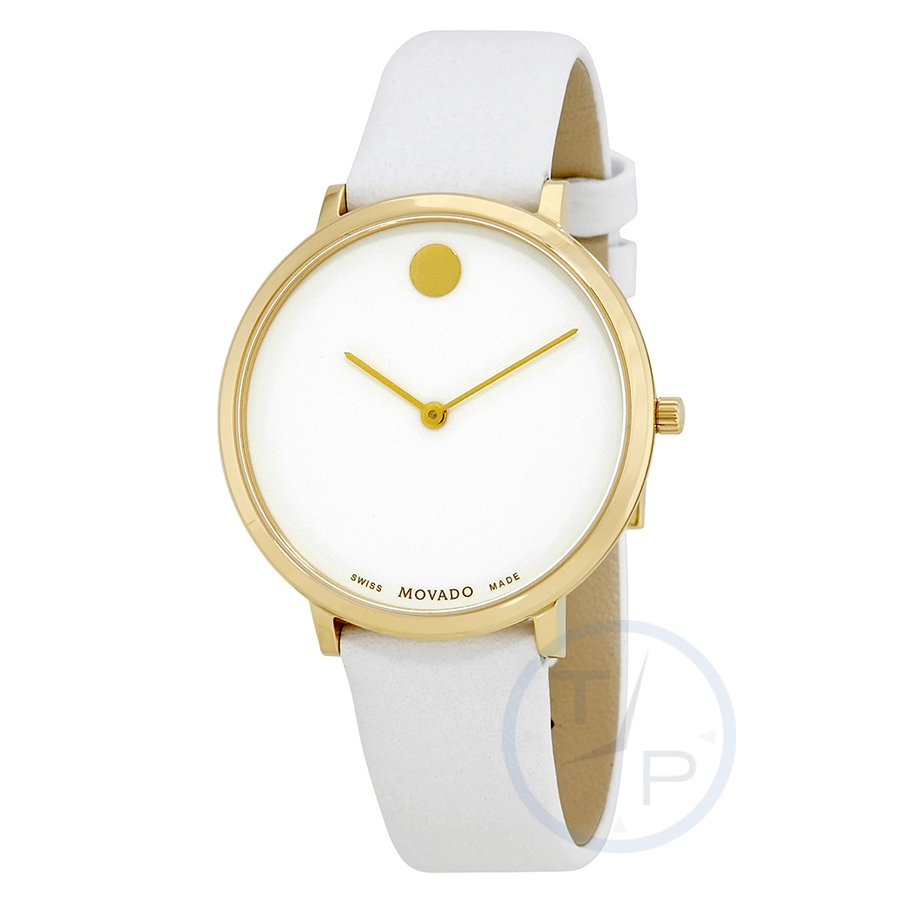 Yellow gold PVD stainless steel case with a white (calfskin) leather strap. Fixed yellow gold PVD bezel. White dial with yellow gold-tone hands. No markers. The Movado dot appears at the 12 o'clock position. Dial Type: Analog. Swiss quartz movement. Scratch resistant sapphire crystal. Pull / push crown. Solid case back. Case size: 35 mm. Case thickness: 5.85 mm. Round case shape. Tang clasp. Water resistant at 100 meters / 330 feet. Functions: hour, minute. Dress watch style. Movado Museum 70th Anniversary White Dial Ladies Watch 0607138.
