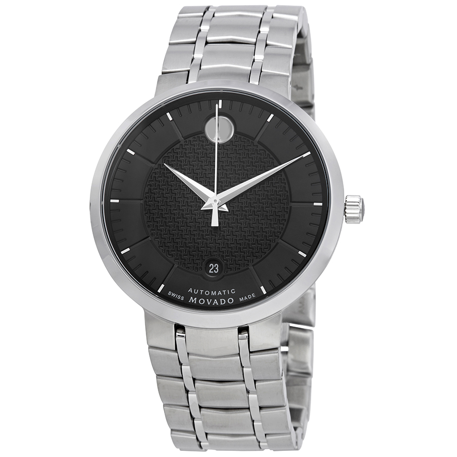 Stainless steel case with a stainless steel bracelet. Fixed stainless steel bezel. Black dial with silver-tone hands and index hour markers. Minute markers around the outer rim The Movado dot appears at the 12 o'clock position. Dial Type: Analog. Date display at the 6 o'clock position. Automatic movement. Scratch resistant sapphire crystal. Push / pull crown. Transparent case back. Round case shape. Case size: 39.5 mm. Hidden fold over clasp. Water resistant at 30 meters / 100 feet. Functions: date, hour, minute, second. Dress watch style. Watch label: Swiss Made. Movado 1881 Automatic Black Dial Mens Watch 0607164.