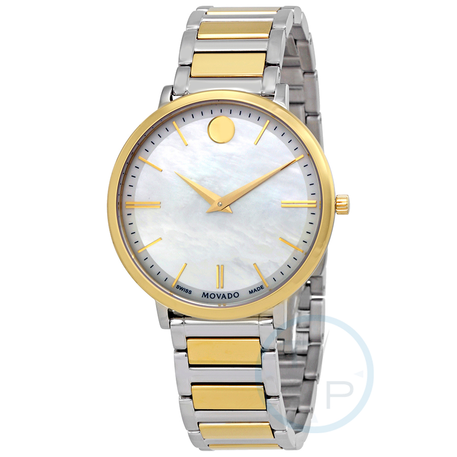 Stainless steel case with a two-tone (silver and gold-tone PVD) stainless steel bracelet. Fixed yellow gold PVD bezel. Mother of pearl dial with yellow gold-tone hands and index hour markers. Minute markers around the outer rim. The Movado dot appears at the 12 o'clock position. Dial Type: Analog. Quartz movement. Scratch resistant sapphire crystal. Pull / push crown. Solid case back. Round case shape. Case size: 35 mm. Case thickness: 6.3 mm. Band width: 15.95 mm. Fold over clasp with a push button release. Water resistant at 30 meters / 100 feet. Functions: hour, minute. Dress watch style. Watch label: Swiss Made. Movado Ultra Slim Mother of Pearl Dial Ladies Watch 0607171.