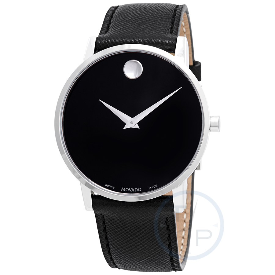 Silver-tone stainless steel case with a black (textured) leather strap. Fixed silver-tone stainless steel bezel. Black dial with silver-tone hands. No markers. movado dot appears at the 12 o'clock position. Dial Type: Analog. Ronda 702 quartz movement. Scratch resistant sapphire crystal. Pull / push crown. Solid case back. Round case shape, case size: 40 mm, case thickness: 6.3 mm. Tang clasp. Water resistant at 30 meters / 100 feet. Functions: hour, minute. Dress watch style. Watch label: Swiss Made. Movado Museum Classic Black Dial Black Leather Mens Watch 0607194.