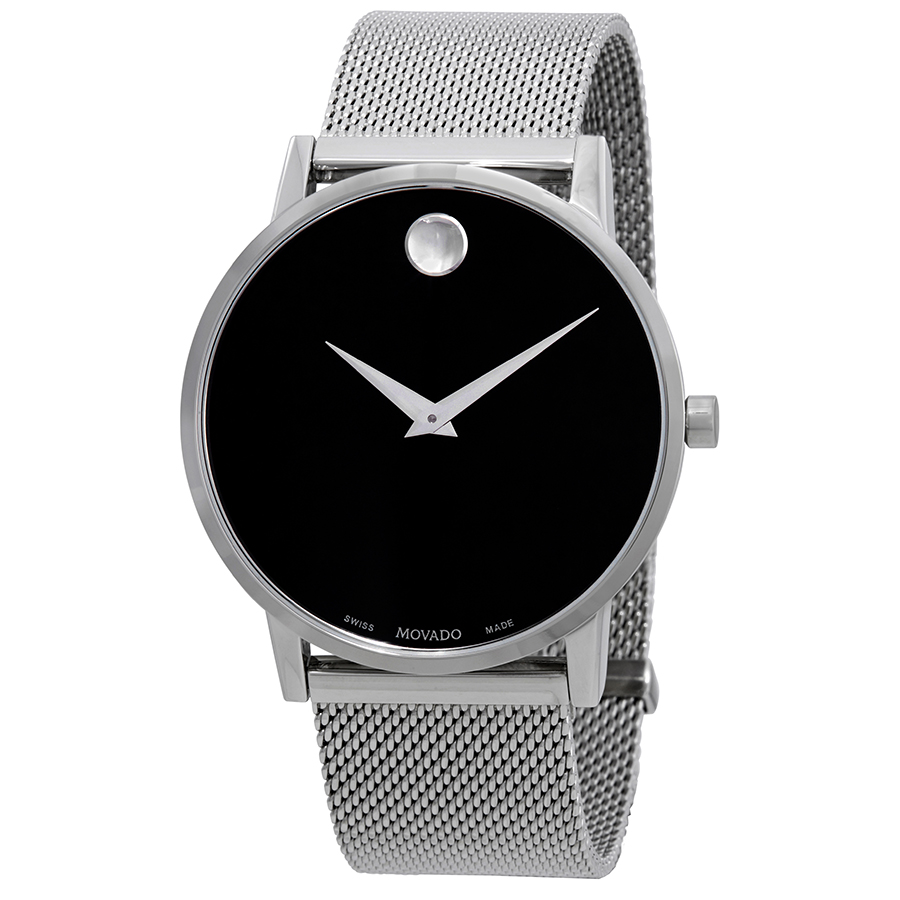 Stainless steel case with a silver-tone stainless steel mesh bracelet. Fixed stainless steel bezel. Black dial with silver-tone hands. No markers. The Movado dot appears at the 12 o'clock position. Dial Type: Analog. Quartz movement. Scratch resistant sapphire crystal. Pull / push crown. Solid case back. Round case shape. Case size: 40 mm. Band width: 21 mm. Sliding closure clasp. Water resistant at 30 meters / 100 feet. Functions: hour, minute. Casual watch style. Watch label: Swiss Made. Movado Museum Classic Black Dial Mens Watch 0607219.