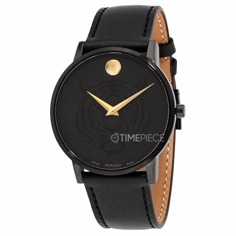 Black PVD stainless steel case with a black leather strap. Fixed black PVD bezel. Black (engraved Year of the Tiger) dial with gold-tone hands. Nio markers. The Movado dot appears at the 12 o'clock position. Dial Type: Analog. Quartz movement. Scratch resistant sapphire crystal. Pull / push crown. Solid case back. Round case shape. Case size: 40 mm. Band width: 20 mm. Tang clasp. Water resistant at 30 meters / 100 feet. Casual watch style. Watch label: Swiss Made. Movado Quartz Year of the Tiger Dial Ladies Watch 0607586.