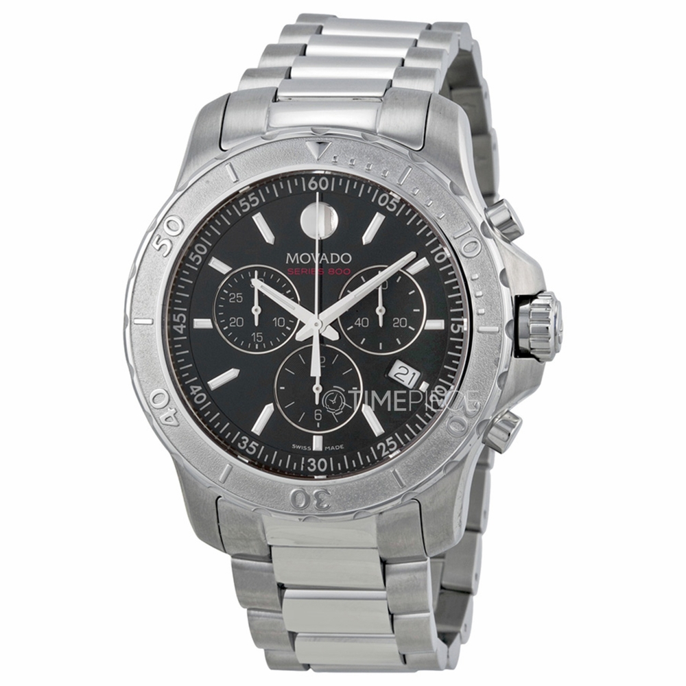 Stainless steel case with a stainless steel bracelet. Uni-directional rotating stainless steel bezel. Black dial with silver-tone hands and stick hour markers. The Movado dot marks the 12 o'clock position. Minute markers around the outer rim. Dial Type: Analog. Luminescent hands and markers. Date display at the 4 o'clock position. Chronograph - three sub-dials displaying: 60 second, 30 minute and 12 hour. Quartz movement. Scratch resistant sapphire crystal. Solid case back. Case diameter: 42 mm. Case thickness: 12.4 mm. Round case shape. Deployment clasp with a push button release. Water resistant at 200 meters / 660 feet. Functions: chronograph, date, hour, minute, second. Dress watch style. Watch label: Swiss Made. Movado Series 800 Chronograph Black Dial Stainless Steel Mens Watch 2600110.