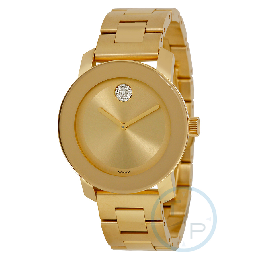 Yellow gold ion-plated stainless steel case and bracelet. Fixed yellow gold ion-plated bezel. Gold dial with yellow gold-tone hands. No markers. Clear crystal-set Movado dot apperas at the 12 o'clock position. Dial Type: Analog. Quartz movement. Scratch resistant K1 crystal. Pull / push crown. Solid case back. Case size: 36 mm, case thickness: 11 mm. Round case shape. Band width: 18 mm. Deployment clasp with a push button release. Water resistant at 30 meters / 100 feet. Functions: hour, minute. Casual watch style. Watch label: Swiss Made. Movado Bold Gold Dial Yellow Gold Ion-plated Ladies Watch 3600104.