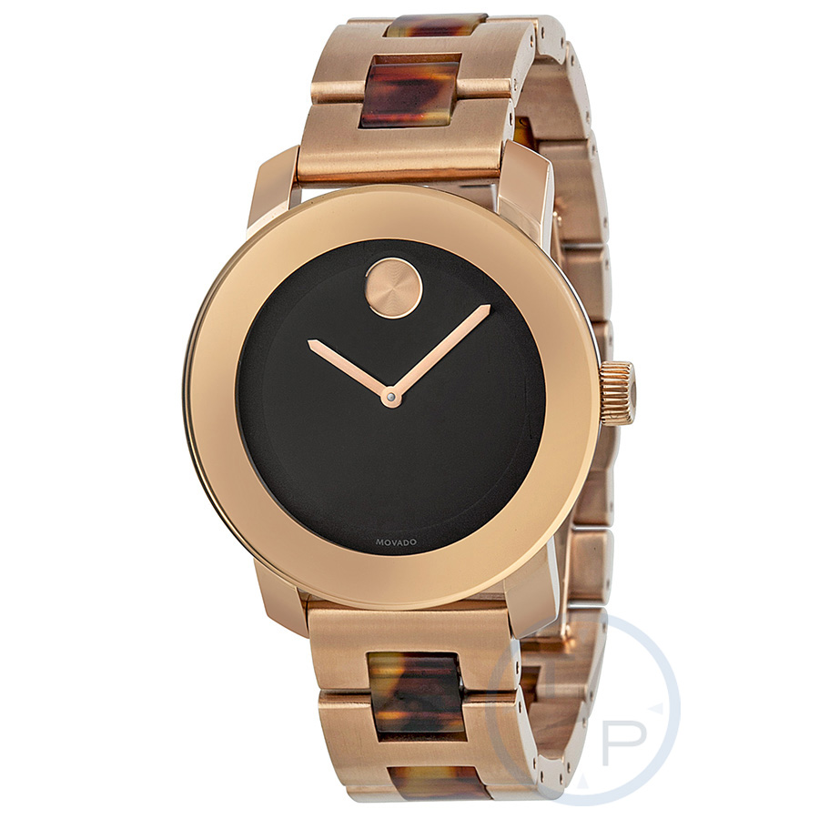 Rose gold PVD stainless steel case with a rose gold PVD stainless steel bracelet with tortoiseshell inserts. Fixed rose gold PVD bezel. Brown dial with rose gold-tone hands. No markers. The Movado dot appears at the 12 o'clock position. Dial Type: Analog. Quartz movement. Scratch resistant mineral crystal. Pull / push crown. Solid case back. Round case shape. Case size: 36 mm. Case thickness: 10 mm. Band width: 18 mm. Deployment clasp. Water resistant at 30 meters / 100 feet. Functions: hour, minute. Casual watch style. Watch label: Swiss Made. Movado Bold Brown Dial Rose Gold PVD Unisex Watch 3600189.