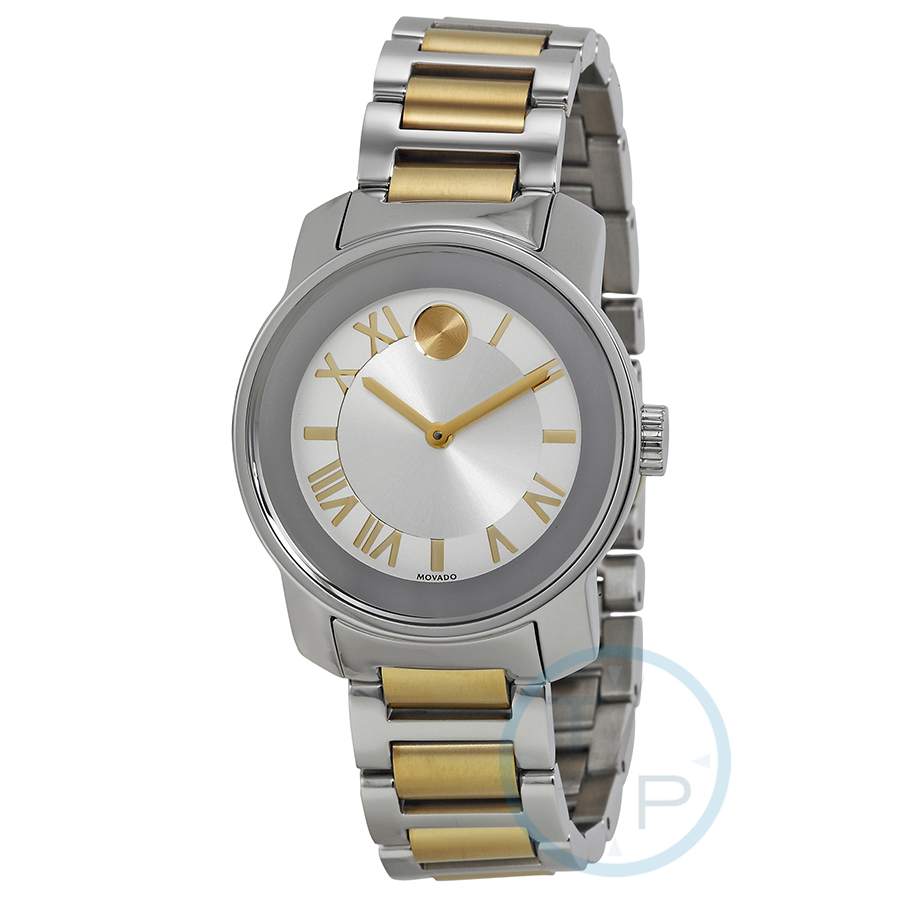 Stainless steel case with a two-tone (silver and gold-tone) stainless steel bracelet. Fixed stainless steel bezel. Silver dial with gold-tone hands and Roman numeral hour markers. The Movado dot marks the 12 o'clock position. Dial Type: Analog. Quartz movement. Scratch resistant K1 crystal. Pull / push crown. Solid case back. Case diameter: 32 mm. Case thickness: 8 mm. Round case shape. Bracelet width: 11 mm. Deployment clasp. Water resistant at 30 meters / 100 feet. Functions: hour, minute. Dress watch style. Movado Bold Quartz Silver Dial Two-tone Ladies Watch 3600245