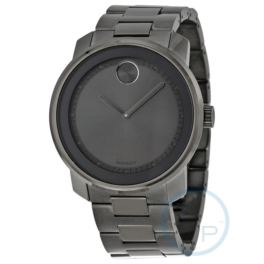 Grey ion-plated stainless steel case and bracelet. Fixed grey ion-plated bezel. Grey dial with grey hands and index hour markers. Minute markers around the outer rim. The Movado dot appears at the 12 o'clock position. Dial Type: Analog. Quartz movement. K1 scratch resistant mineral crystal. Pull / push crown. Solid case back. Case size: 42.5 mm, case thickness: 13 mm. Round case shape. Band width: 28 mm. Deployment clasp with a push button release. Water resistant at 30 meters / 100 feet. Functions: hour, minute. Additional Info: in general, withstands splashes or brief immersion in water, but not suitable for swimming. Luxury watch style. Movado Bold Grey Dial Grey Ion-plated Mens Watch 3600259.