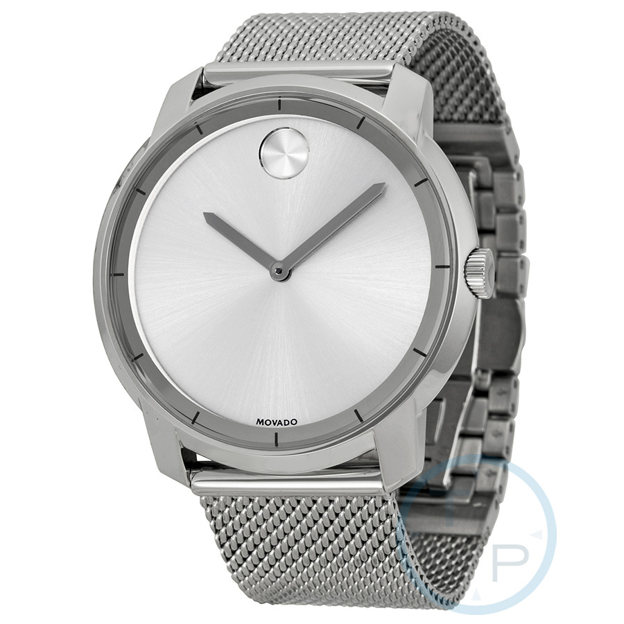 Stainless steel case with a stainless steel mesh bracelet. Fixed stainless steel bezel. Silver dial with silver-tone hands and index hour markers. The Movado dot marks the 12 o'clock position. Dial Type: Analog. Quartz movement. Scratch resistant K1 crystal. Pull / push crown. Solid case back. Round case shape. Case size: 44 mm. Case thickness: 8 mm. Band width: 22 mm. Deployment clasp. Water resistant at 30 meters / 100 feet. Functions: hour, minute, second. Additional Info: in general, withstands splashes or brief immersion in water, but not suitable for swimming. Casual watch style. Movado Bold Silver Dial Stainless Steel Mesh Mens Watch 3600260.
