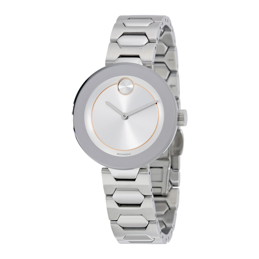 Stainless steel case with a stainless steel bracelet. Fixed stainless steel bezel. Silver dial with silver-tone hands. The Movado dot appears at the 12 o'clock position. Dial Type: Analog. Quartz movement. Scratch resistant K1 mineral crystal. Pull / push crown. Solid case back. Case size: 32 mm. Case thickness: 8 mm. Round case shape. Bracelet width: 14.5 mm. Deployment clasp. Water resistant at 30 meters / 100 feet. Functions: hour, minute,. Casual watch style. Movado Bold Silver Dial Ladies Watch 3600381.
