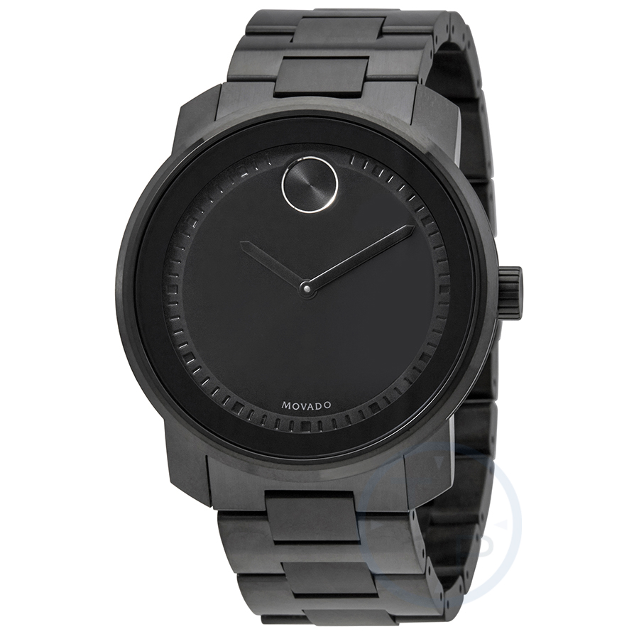 Black ion-plated stainless steel case with a black ion-plated stainless steel bracelet. Fixed black ion-plated stainless steel bezel. Black dial with black hands and index hour markers. Minute markers around the outer rim. The Movado dot appears at the 12 o'clock position. Dial Type: Analog. Quartz movement. Scratch resistant mineral K1 crystal. Solid case back. Case size: 42.5 mm. Round case shape. Fold over clasp with a push button release. Water resistant at 30 meters / 100 feet. Functions: hour, minute. Dress watch style. Movado Bold Black Dial Stainless Steel Mens Watch 3600471.