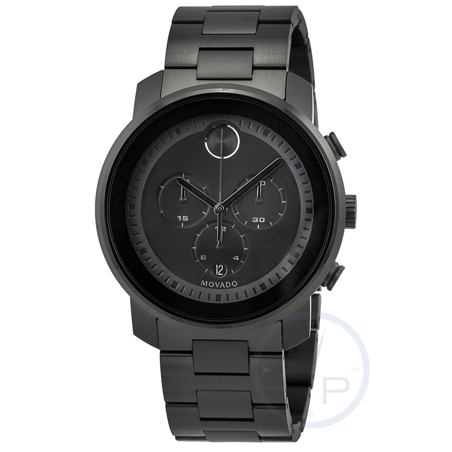 Black ion-plated stainless steel case with a black stainless steel bracelet. Fixed black ion-plated bezel. Black dial with black hands and index hour markers. Minute markers around the outer rim. The Movado dot appears at the 12 o'clock positions. Dial Type: Analog. Date display at the 6 o'clock position. Chronograph - three sub-dials displaying:60 second, 30 minute and 12 hours. Quartz movement. Scratch resistant mineral K1 crystal. Solid case back. Round case shape. Case size: 44 mm. Deployment clasp with a push button release. Water resistant at 30 meters / 100 feet. Functions: chronograph, date, hour, minute, second. Sport watch style. Watch label: Swiss Made. Movado Bold Chronograph Black Dial Mens Watch 3600472.