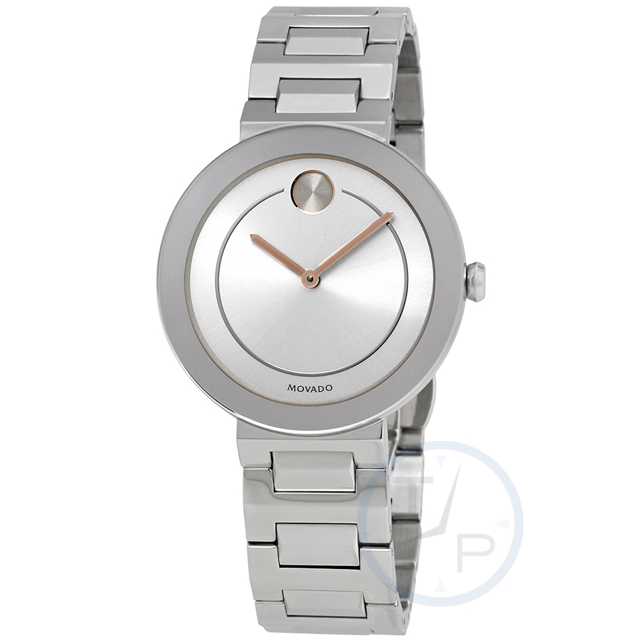 Stainless steel case with a stainless steel bracelet. Fixed stainless steel bezel. Silver dial with rose gold-tone hands. No markers. The Movado dot appears at the 12 o'clock position. Dial Type: Analog. Quartz movement. Scratch resistant K1 mineral crystal. Pull / push crown. Solid case back. Round case shape. Case size: 34 mm. Deployment clasp. Water resistant at 30 meters / 100 feet. Functions: hour, minute. Casual watch style. Movado Bold Silver Dial Ladies Watch 3600497.