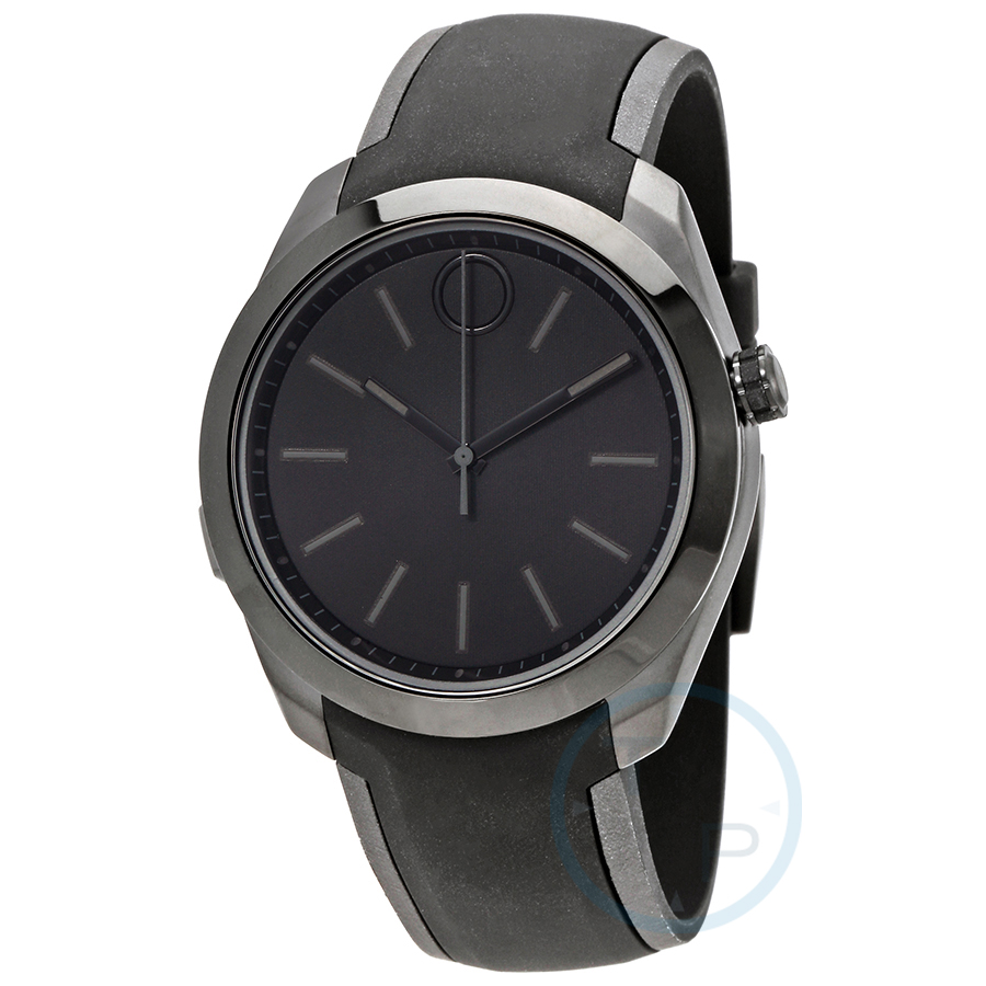 Silver-tone stainless steel case with a grey silicone strap. Fixed silver-tone stainless steel bezel. Black dial with black hands and index hour markers. Minute markers around the outer rim. Dial Type: digital. Luminescent hands and markers. Quartz movement. Scratch resistant k1 mineral crystal. Solid case back. Round case shape. Case size: 44 mm. Tang clasp. Water resistant at 50 meters / 165 feet. Functions: hour, minute, second, mobile alerts, fitness tracker, ios 8+ and android 4.4+ compatible. Bluetooth connectivity. Additional Info: engineered by hp. Smart watch style. Movado Bold Motion Black Dial Smart Watch 3660002.