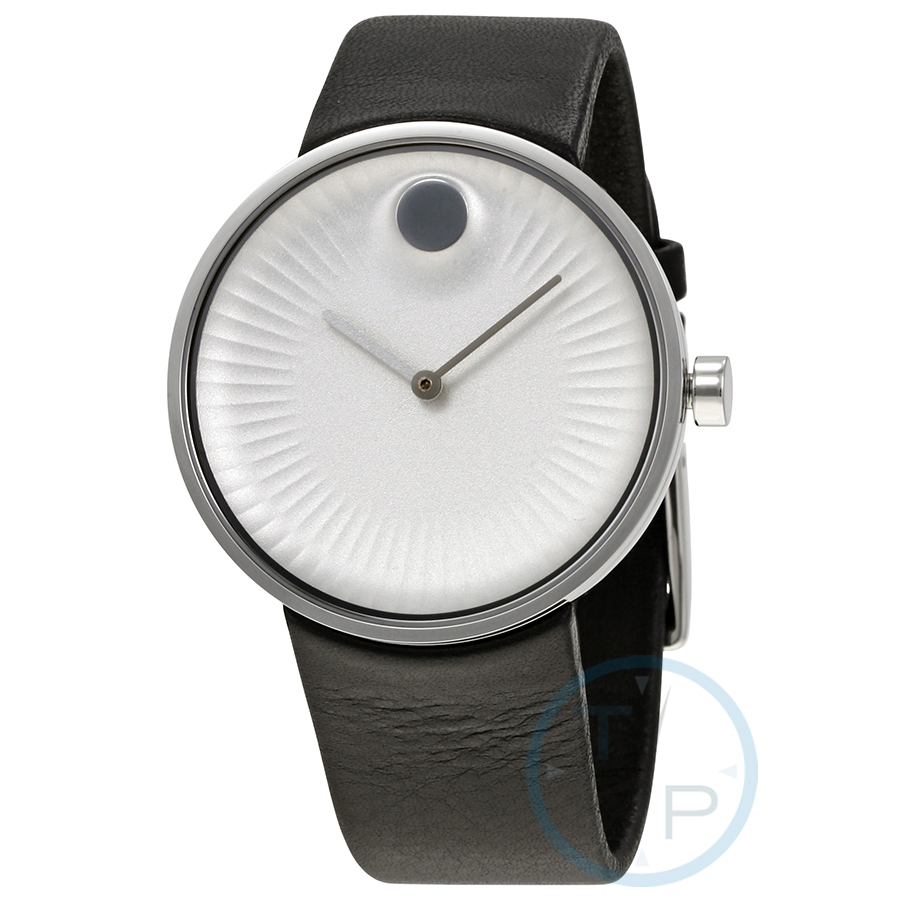 Stainless steel case with a black leather strap. Fixed stainless steel bezel. Concave sandblasted silver aluminum dial with silver / black hands. No markers. The Movado dot appears at the 12 o'clock position. Dial Type: Analog. Quartz movement. Scratch resistant sapphire crystal. Pull / push crown. Solid case back. Round case shape. Case size: 40 mm. Case thickness: 9 mm. Band width: 22 mm. Tang clasp. Water resistant at 30 meters / 100 feet. Functions: hour, minute. Additional Info: in general, withstands splashes or brief immersion in water, but not suitable for swimming. Casual watch style. Movado Edge Silver Aluminum Dial Mens Watch 3680001.