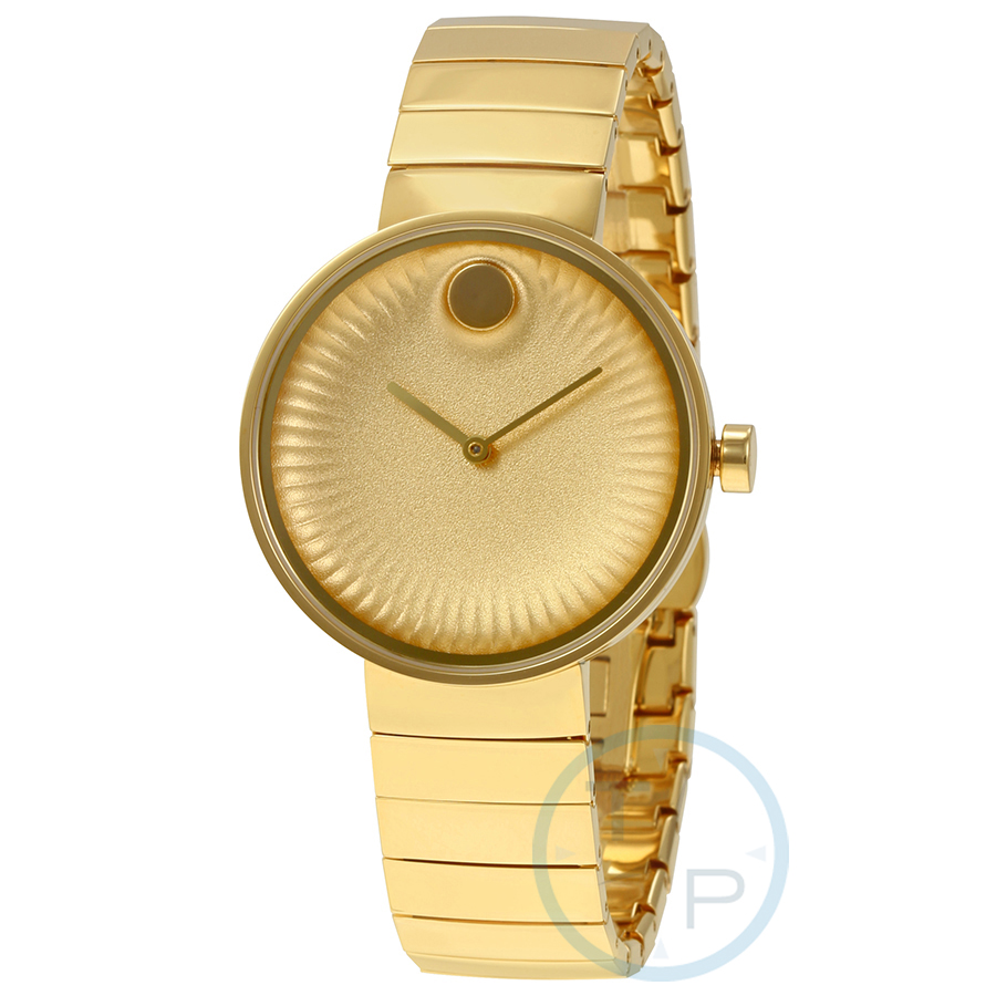 Yellow gold ion-plated stainless steel case and bracelet. Fixed yellow gold ion-plated bezel. Sandblasted yellow gold aluminum dial with yellow gold-tone hands. No markers. The Movado dot appears at the 12 o'clock position. Dial Type: Analog. Quartz movement. Scratch resistant sapphire crystal. Pull / push crown. Solid case back. Case size: 34 mm. Case thickness: 9 mm. Round case shape. Band width: 16 mm. Deployment with push button release clasp. Water resistant at 30 meters / 100 feet. Functions: hour, minute. Dress watch style. Movado Edge Yellow Gold Aluminum Dial Ladies Watch 3680014.
