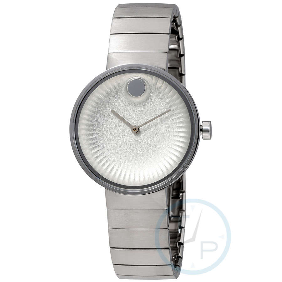 Silver-tone stainless steel case with a silver-tone stainless steel bracelet. Fixed silver-tone stainless steel bezel. Silver metallic dial with silver-tone hands. No markers. Movado dot marks the 12 o'clock position. Dial Type: Analog. Quartz movement. Scratch resistant sapphire crystal. Pull / push crown. Solid case back. Round case shape. Case size: 34 mm. Band width: 20 mm, band length: 7 inches. Deployment clasp. Water resistant at 30 meters / 100 feet. Functions: hour, minute. Dress watch style. Watch label: Swiss Made. Movado Edge Silver Dial Stainless Steel Ladies Watch 3680015.