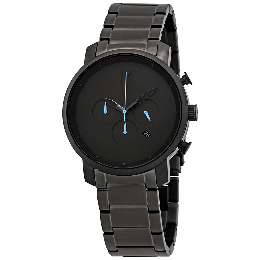 Gunmetal-plated stainless steel case and bracelet. Fixed gunmetal-plated bezel. Gunmetal dial with black hands and index hour markers. Dial Type: Analog. Date display between the 4 and 5 o'clock positions. Chronograph - three sub-dials displaying: 60 second, 30 minute and 24 hours. Quartz movement. Scratch resistant mineral crystal. Pull / push crown. Solid case back. Round case shape. Case size: 45 mm. Case thickness: 11.5 mm. Band width: 22.5 mm. Fold over clasp. Water resistant at 50 meters / 165 feet. Functions: chronograph, date, hour, minute, second. Casual watch style. MVMT Chrono Gunmetal Chronograph Quartz Gunmetal Dial Mens Watch MC01-GU.