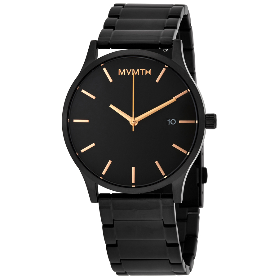 Black PVD stainless steel case and bracelet. Fixed black PVD bezel. Black dial with rose gold-tone hands and index hour markers. Date display at the 3 o'clock position. Quartz movement. Scratch resistant mineral crystal. Pull / push crown. Solid case back. Round case shape. Case size: 45 mm. Case thickness: 10 mm. Band width: 24 mm. Fold over clasp with a safety release. Water resistant at 50 meters / 165 feet. Functions: date, hour, minute. Casual watch style. MVMT Classic Quartz Black Dial Black PVD Mens Watch MM01-BBRG.