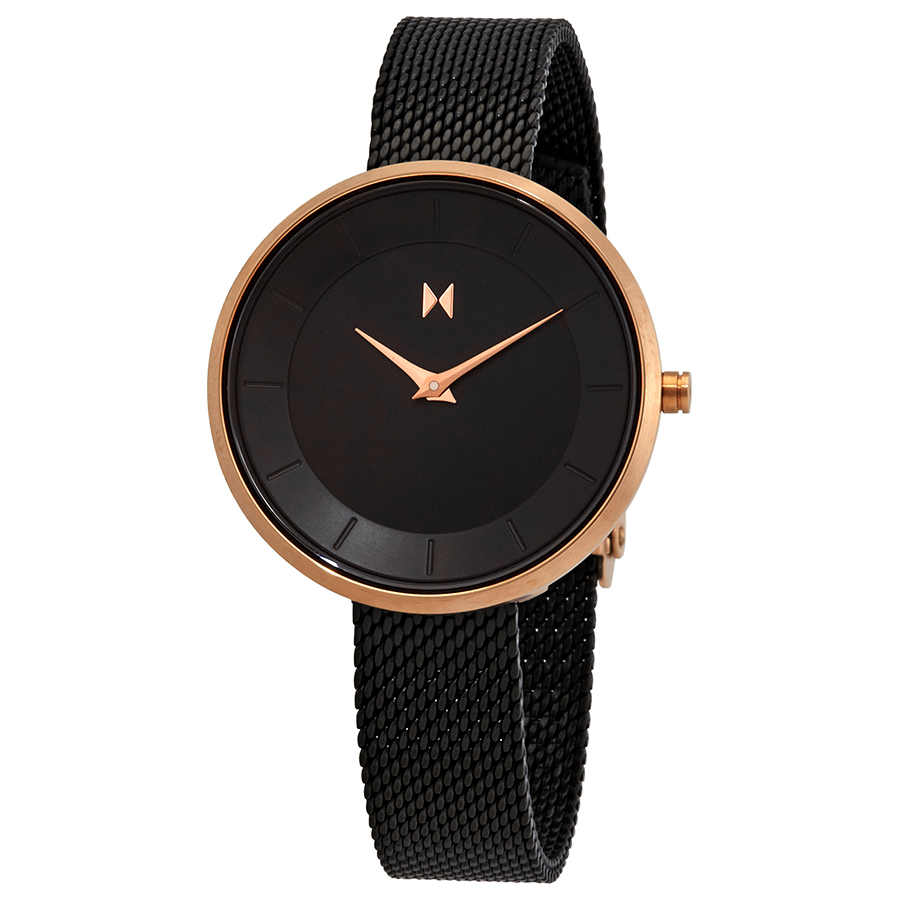 Rose gold-tone brushed stainless steel case with a black PVD stainless steel mesh bracelet. Fixed rose gold-tone bezel. Black dial with rose gold-tone hands and index hour markers. Dial Type: Analog. Quartz movement. Scratch resistant mineral crystal. Pull / push crown. Solid case back. Round case shape. Case size: 32 mm. Case thickness: 7 mm. Band width: 12 mm. Slide through clasp. Water resistant at 50 meters / 165 feet. Functions: hour, minute. Additional Info: perfect for carefree everyday use and can withstand a breif submersion under water, but should not be taken swimming or bathing. Casual watch style. MVMT MOD Quartz Black Dial Ladies Watch FB01-BL.