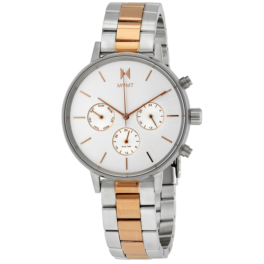 Silver-tone stainless steel case with a two-tone (silver-tone and rose gold PVD) stainless steel bracelet. Fixed stainless steel bezel. Silver dial with rose gold-tone hands and index hour markers. Three sub-dials displaying: 24 hours, 24 hours (dual time) and day of the week. Quartz movement. Scratch resistant mineral crystal. Pull / push crown. Solid case back. Round case shape. Case size: 38 mm. Case thickness: 10 mm. Band width: 16 mm. Fold over clasp. Water resistant at 50 meters / 165 feet. Functions: date, hour, minute, second. Casual watch style. MVMT Nova Quartz Silver Dial Two-tone Ladies Watch FC01-S.