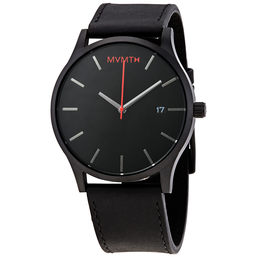 Black ion-plated stainless steel case with a black leather strap. Fixed black ion-plated bezel. Black dial with black hands and index hour markers. Minute markers around the outer rim. Dial Type: Analog. Quartz movement. Scratch resistant mineral crystal. Pull / push crown. Solid case back. Round case shape. Case size: 45 mm. Case thickness: 9 mm. Band width: 24 mm. Tang clasp. Water resistant at 30 meters / 100 feet. Functions: hour, minute, second. Casual watch style. MVMT Classic Black Dial Black Leather Mens Watch L213.5L.551.